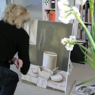 Eine Reihen-Hängung von 12 kleinformatigen Sujets für einen Sitzungssaal, ein großes Kürbis-Stillleben im Schattenfugenrahmen über einer alten bäuerlichen Anrichte, zwei mittelformatige „Dialoge" in einem kleinen Besprechungsraum: Ihre Werke scheinen immer wie für den Raum gemacht. Sie korrespondieren mit der Architektur und der Einrichtung, nehmen Bezug auf den Zweck der Räumlichkeit oder ergänzen diese sogar, dem Corporate Design entsprechend, mit farblich abgepassten Passepartouts und Rahmeneinfärbungen in den Hausfarben eines Unternehmens. Rosemarie Druivenga ist nicht nur Künstlerin. Sie ist auch ein Profi, der von der ersten Auftragsbesprechung bis zur perfekten und sicheren Hängung Ihrer Werke jedes Detail im Auge behält.